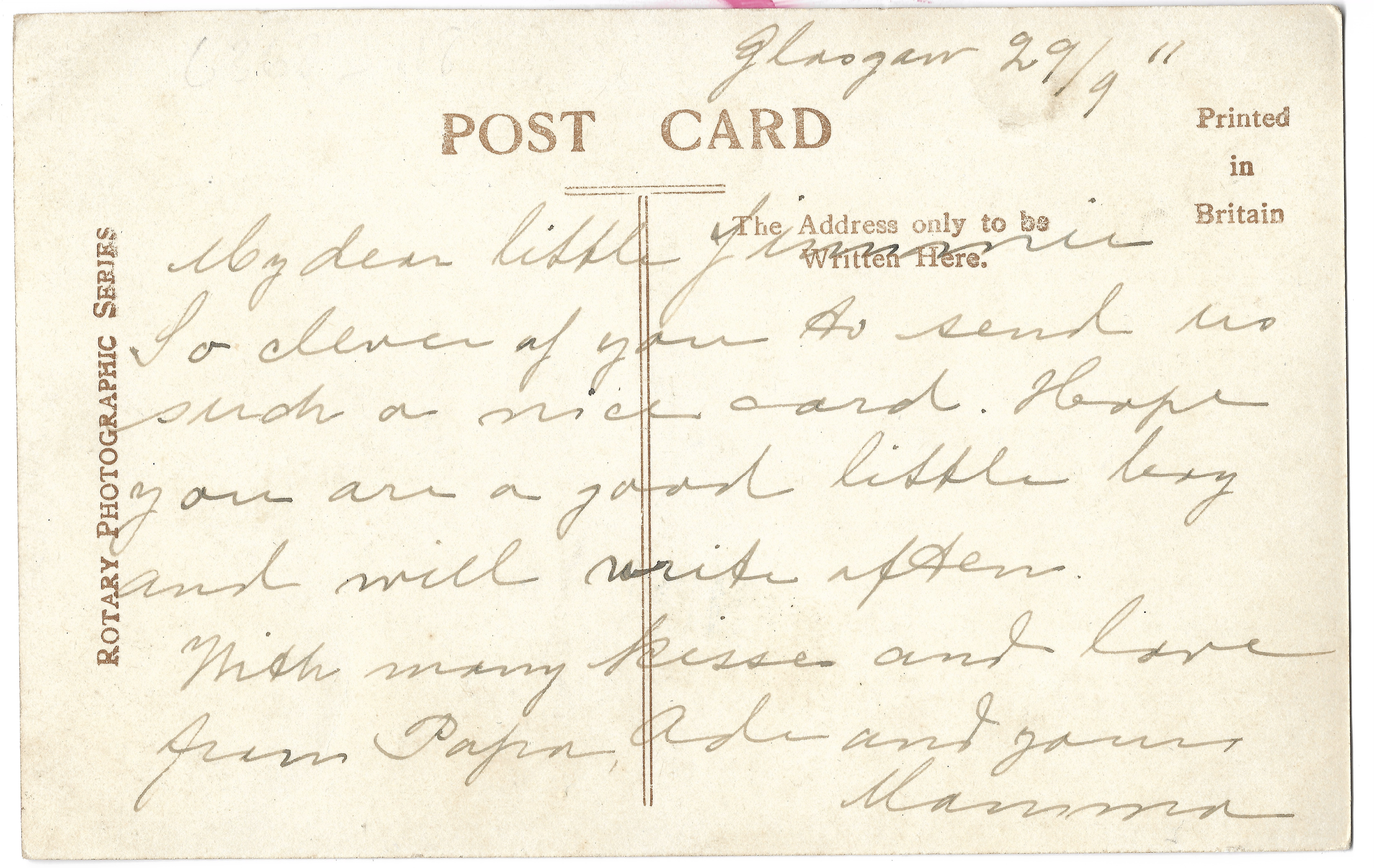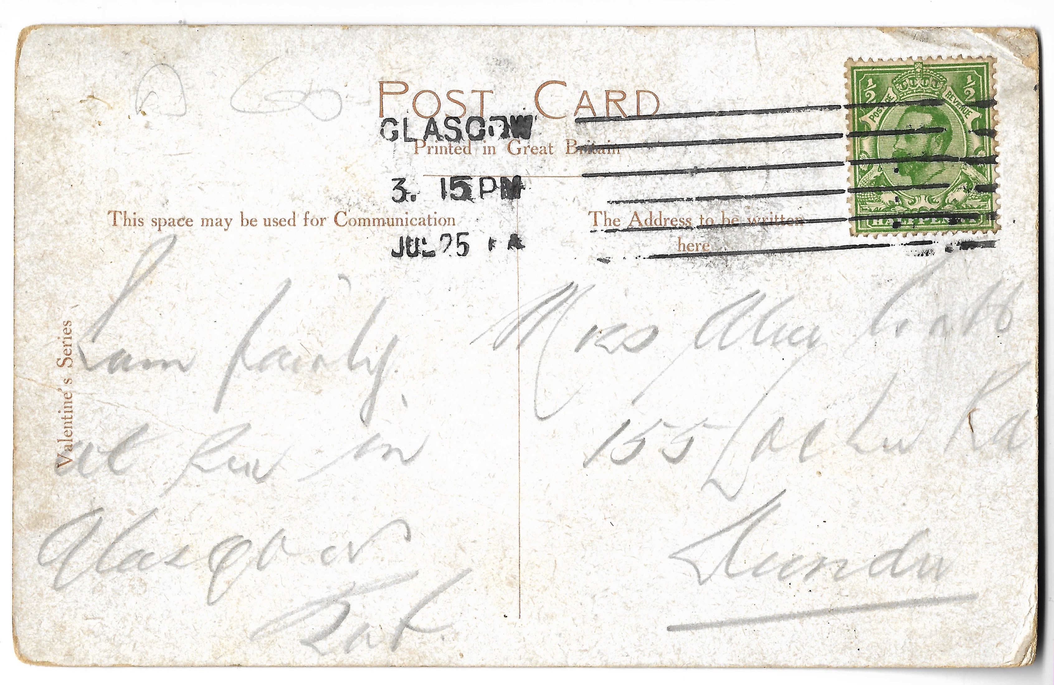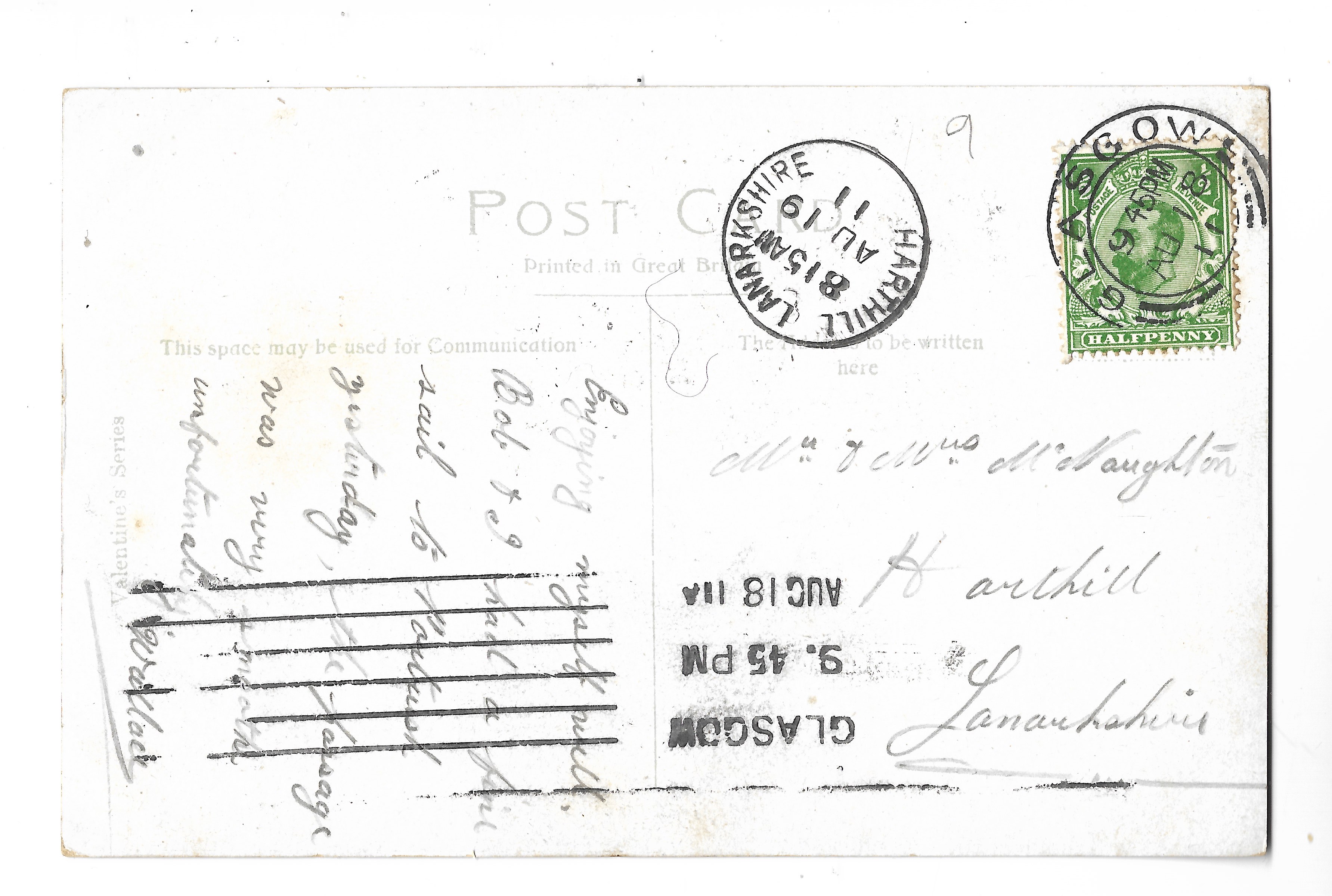 Just a P.C. to say I am still in Glasgow. I will be another week yet & then I am going to Edinburgh for a week. We have lovely weather so you will likely have the harvest finished by this time. I am thinking how to get back, I don’t think I will start - here. In at the Exhibition last night, I have not been much. I am going to have some holiday now when I’ve got the chance, hope you are all well, love to all, your loving friend -’