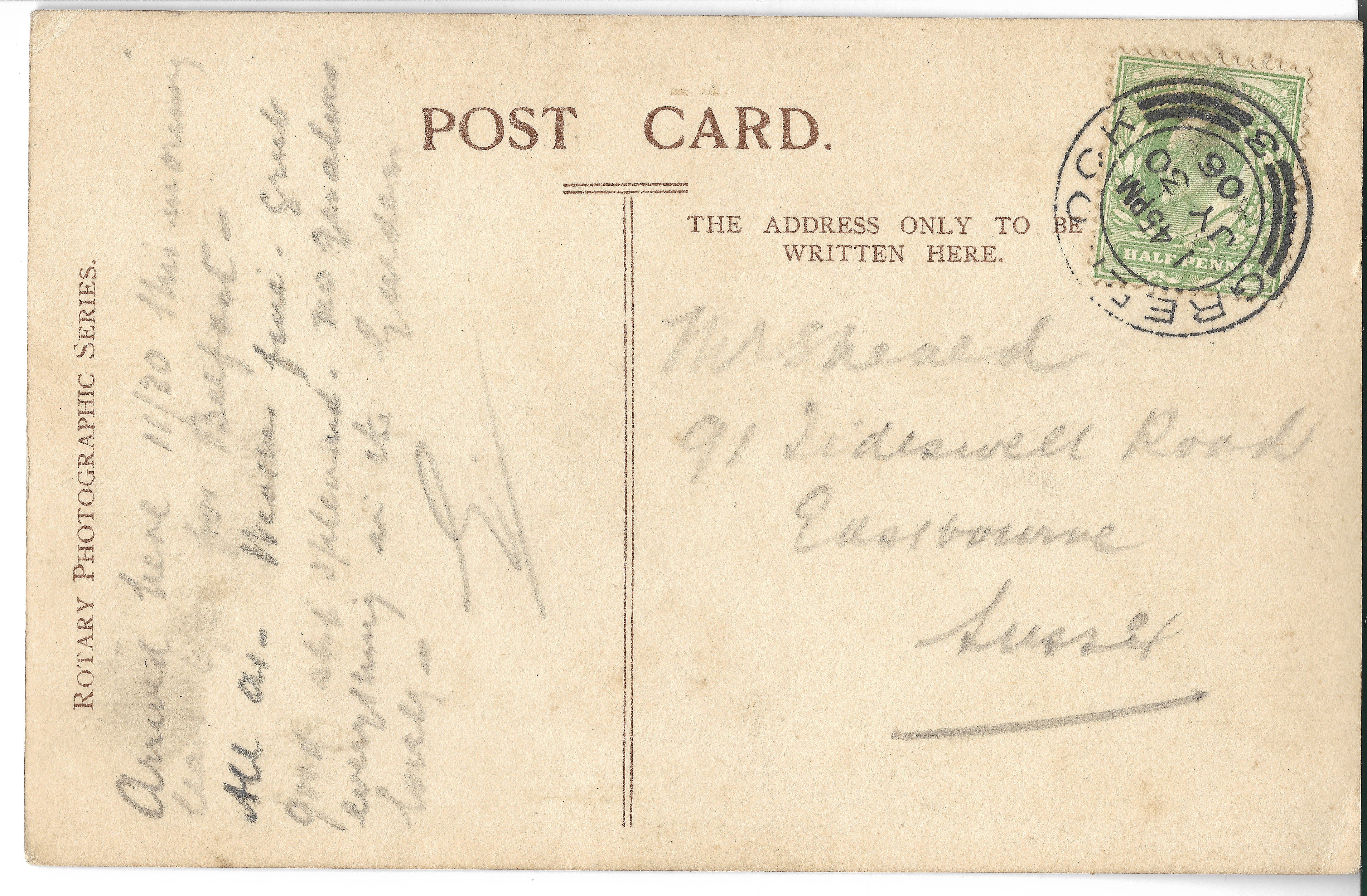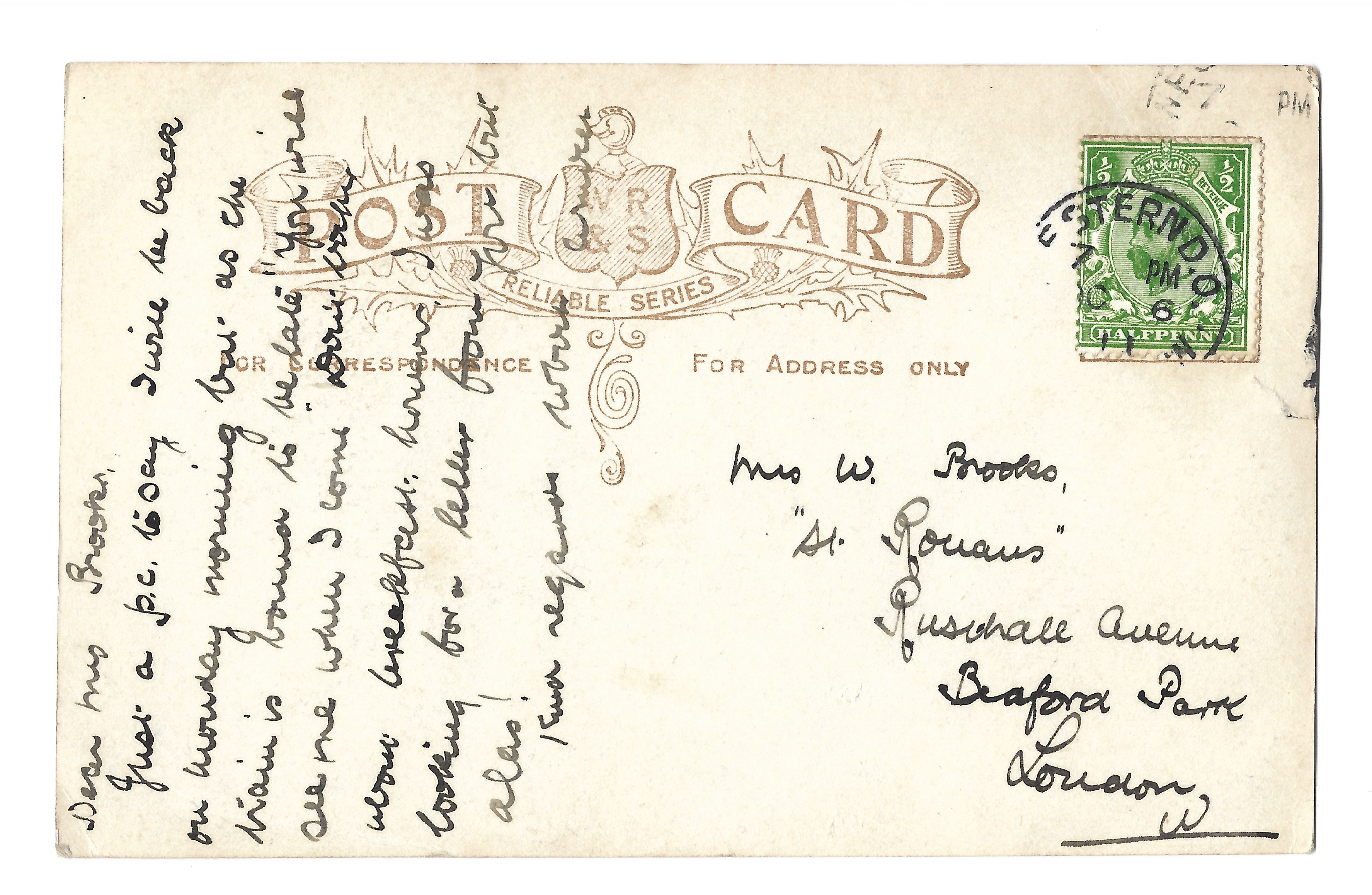 ‘Dear Mrs Brooks,Just a p.c. to say I will be back on Monday morning but as the train is bound to be late you will see me when I come down for breakfast. However I was looking for a letter from you but alas!